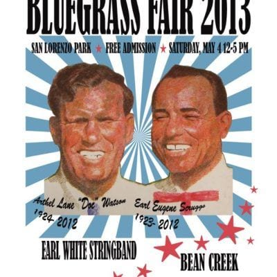 The annual Santa Cruz Bluegrass Fair will be held in San Lorenzo Park at the Duck Pond Stage in Santa Cruz on Saturday, May 4, 2013 from noon-5:00pm. A cavalcade of local bands will be featured: Homefire, The Earl White Stringband, Bean Creek, and The Harmony Grits. This free event is presented by the Santa Cruz Bluegrass Society. They suggest that you bring blankets, low-backed chairs, hats and sunscreen in order to comfortably hang out on the grassy hill next to the pond. This year’s event honors the memory of Doc Watson and Earl Scruggs.
