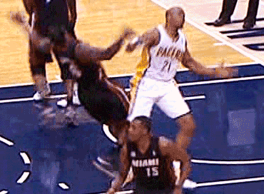 Indiana Pacers Forward Paul George embarrassing Miami Heat Guard Mario Chalmers by hitting a three-pointer in his face after Chalmers attempts to flop but fails to get a call from the officials.