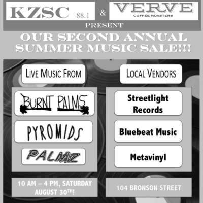 We’re selling an eclectic mix of LPs and CDs for just 25 cents each. If that’s not enough, we’ve also got coffee mugs, tote bags, t-shirts, and other KZSC merch to help you cherish these memories. Groove to live music by Pyromids, Palmz, Burnt Palms, and others while you dig through rare and collectible music from many local vendors like Streetlight Records, Bluebeat Music, and Metavinyl.