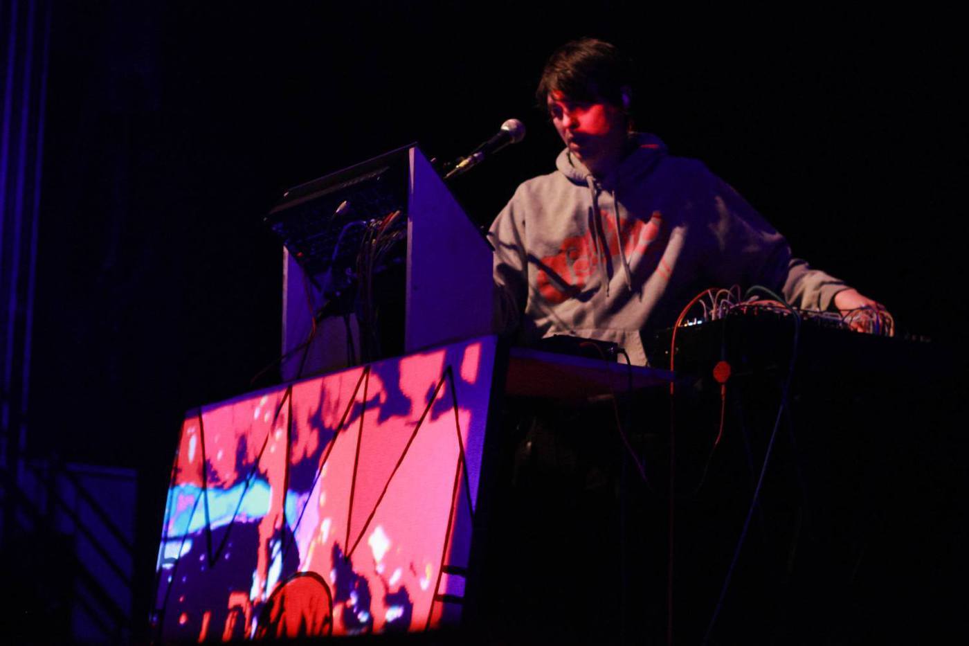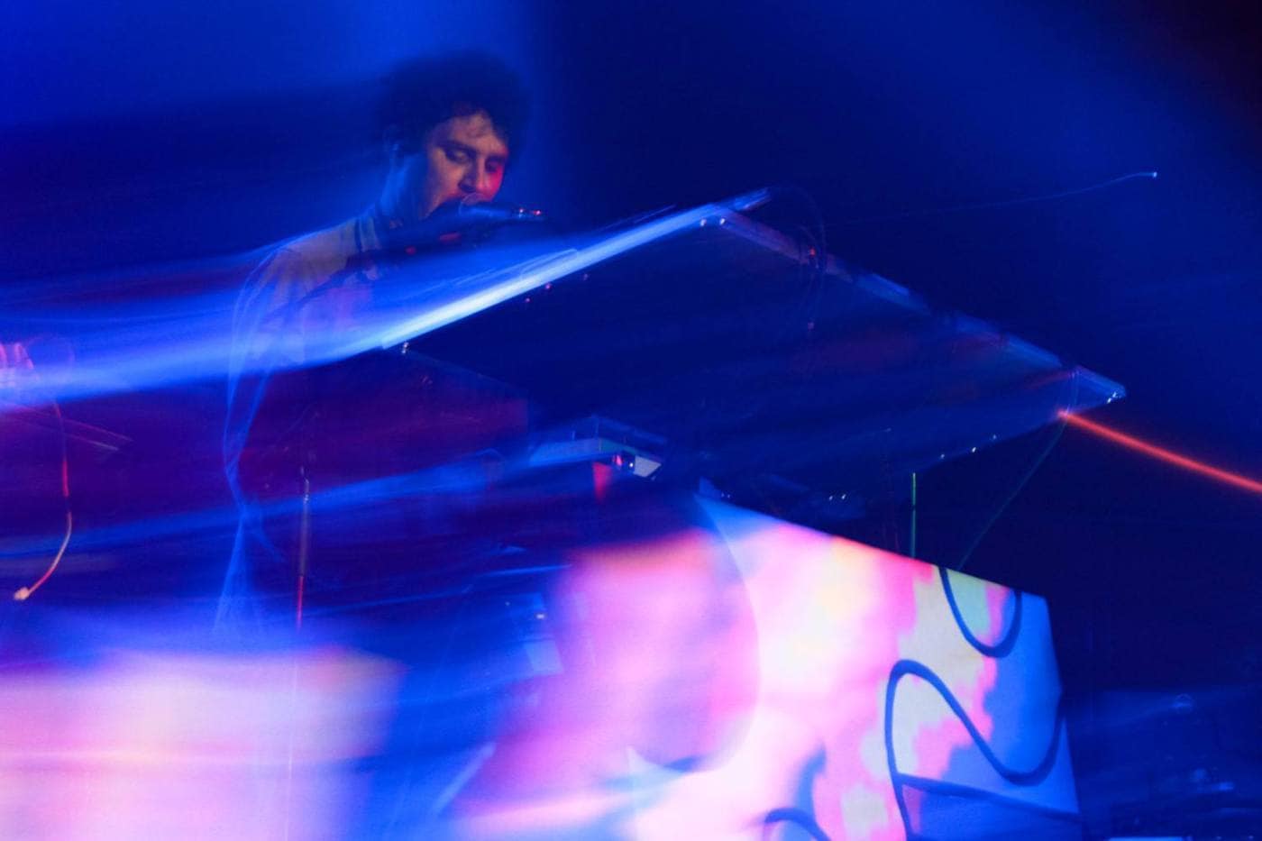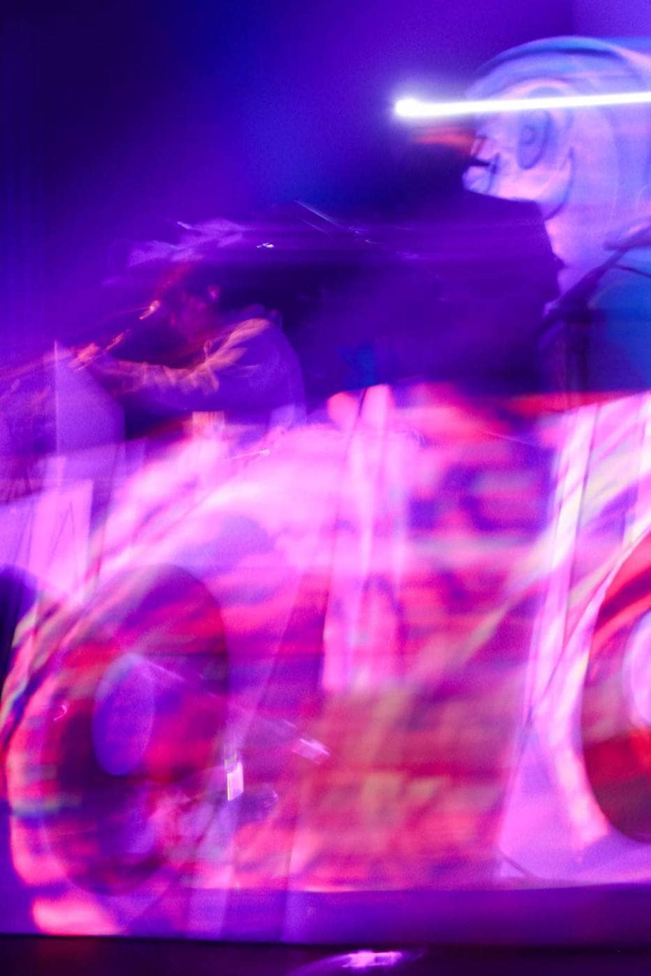 Everybody was very casually dressed that night, one that struck me in particular was Panda Bear’s grey hoodie. The band were there to play music for the crowd, and they had no egos about it. Even in the very brief points where Avey Tare would talk to the crowd, he would always seem very shy and very thankful for where he was at that moment. This was not reflected in their fantastical light show though. The projections that synced with each song were projected onto a large painting that stretched the entire back wall of the stage as well as smaller projections mapped onto the paintings on the front of each member’s station. Lights directed at the audience, band, and sculptures strobed and flickered in fantastical color filled beams of light were a sight to behold.