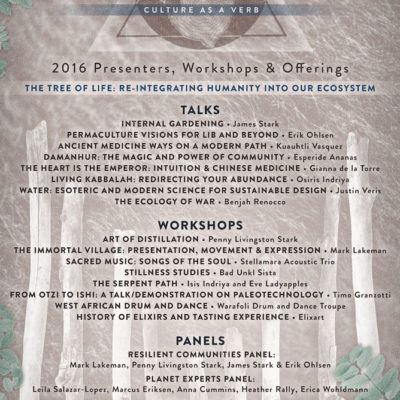 The Village’s 2016 theme, Tree of Life, will focus on re-integrating humanity into right relationship with our ecosystem. A carefully selected groups of Village Earth Stewards will deliver a wide range of programming to help participants move naturally into their empowered role as agents of the lands. These Stewards include two legends of permaculture and regenerative design visionaries Penny Livingston Stark and James Stark, owner of Permaculture Artisans Erik Ohlsen who will speak on Permaculture Visions for LIB and Beyond, and a myriad of speakers from Planet Experts, a growing community of global change makers that includes scientists, advocates, innovators, visionaries and journalists who are committed to protecting our planet by sharing stories that matter.