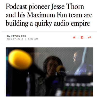 Thorn’s been making podcasts since 2004 when he was 23 years old, and he’s been talking into a mike since even earlier. As a sophomore at UC Santa Cruz, Thorn started “The Sound of Young America,” a radio show on KZSC-FM that eventually evolved into “Bullseye With Jesse Thorn” and made way for the full-fledged production company, Maximum Fun, which he oversees today.